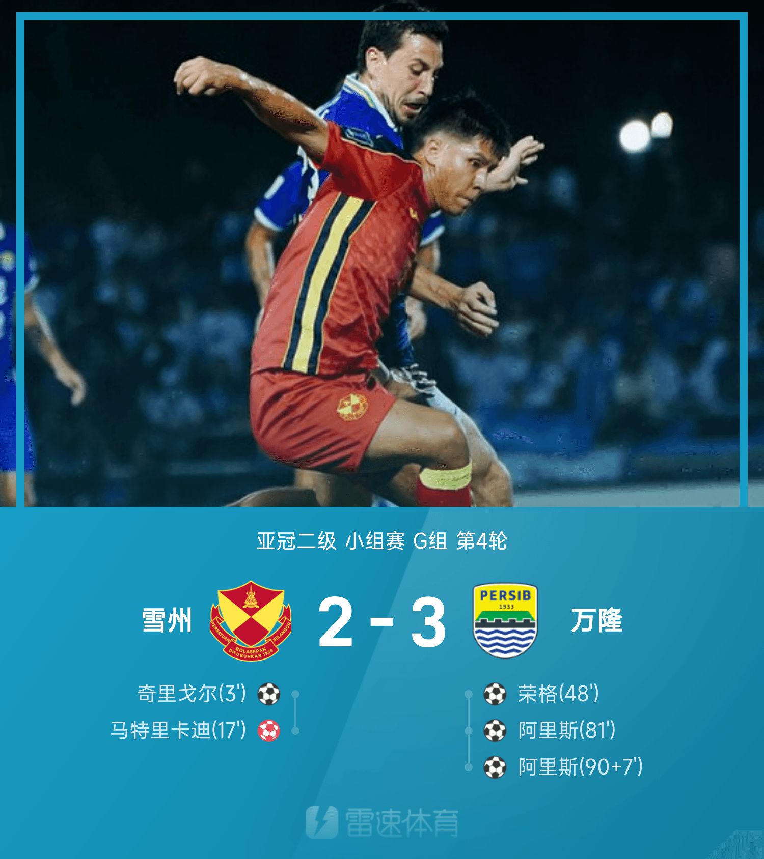 6686体育平台11月06日讯 25/26赛季亚冠二级分组赛G组第4轮,万隆3-2战胜雪州。上半场奇里戈尔开场3分钟闪击,马特里卡迪清球变乌龙,下半场荣格破门扳回一球,阿里斯单刀扳平,补时最后时刻伊赞巨大差错,阿里斯最后一投。