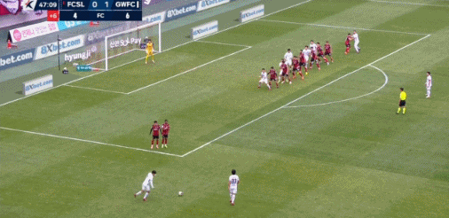 5’首尔自由球主罚到三秒区内,李胜模门前包抄慢了一步