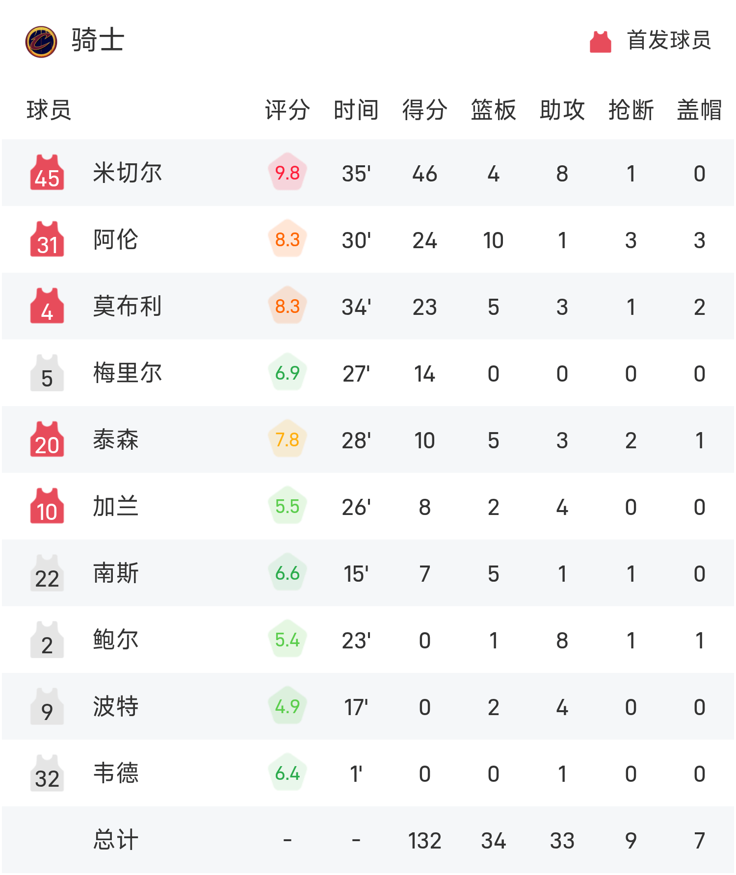 米切尔砍下全场最高的46分4板8助,率领骑士胜利取胜。