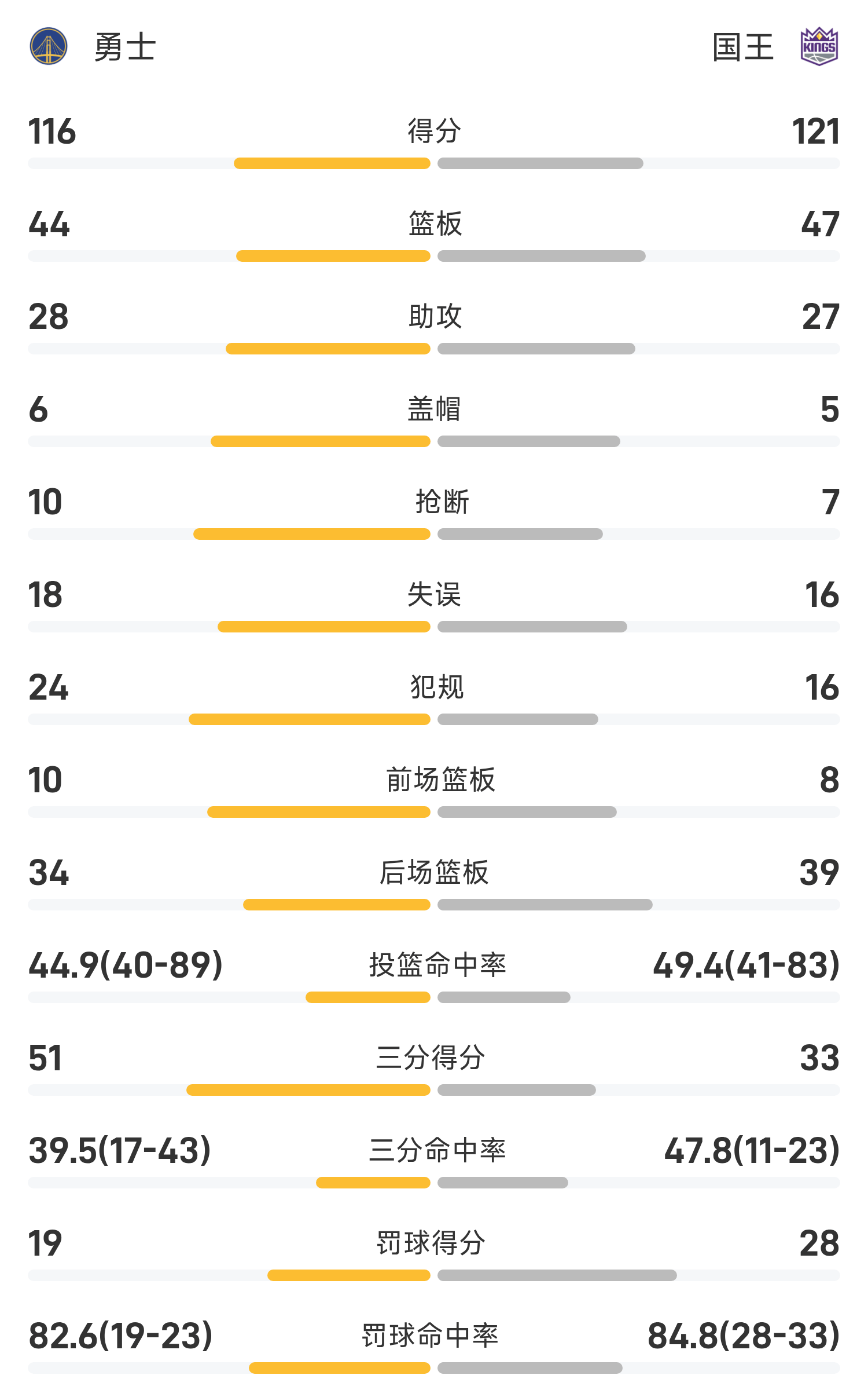 双方全场战罢,国王121-116战胜勇士。