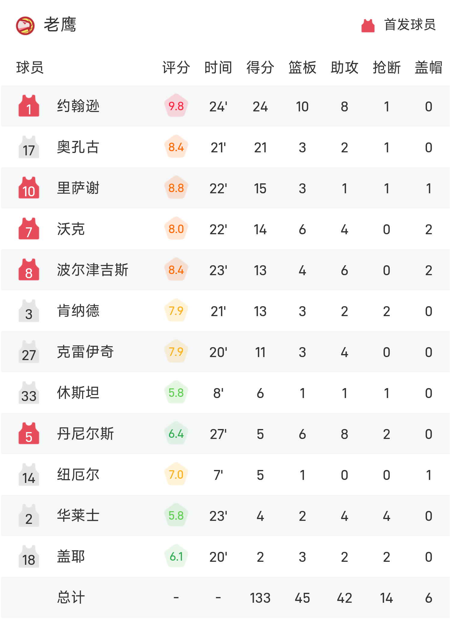 NBA战报:约翰逊24分10板8助,老鹰133-100狂胜国王