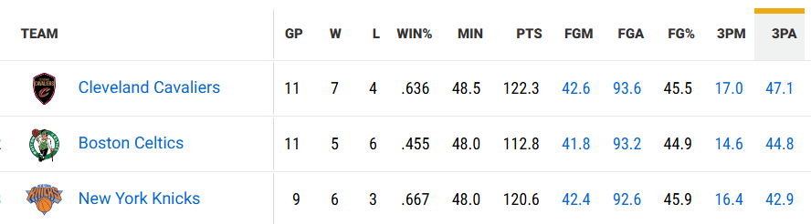 在本场竞赛之前,尼克斯本赛季的场均三分球投射次数42.9次,排在联盟第三,只比骑士和凯尔特人少。