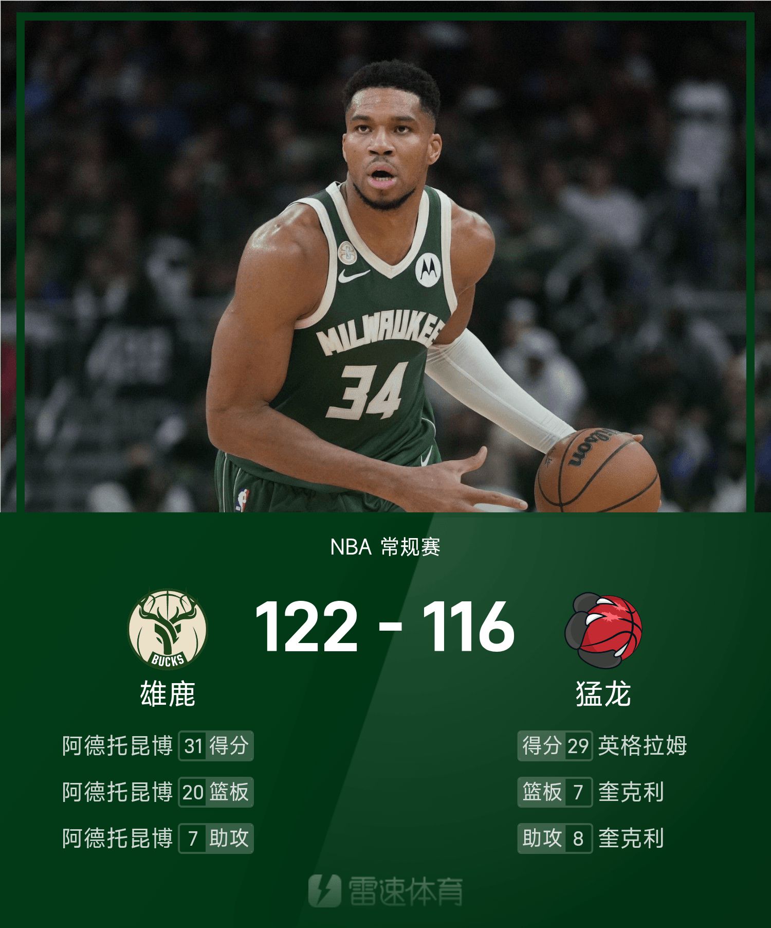 NBA战报:阿德托昆博31分20板7助,雄鹿122-116击败猛龙