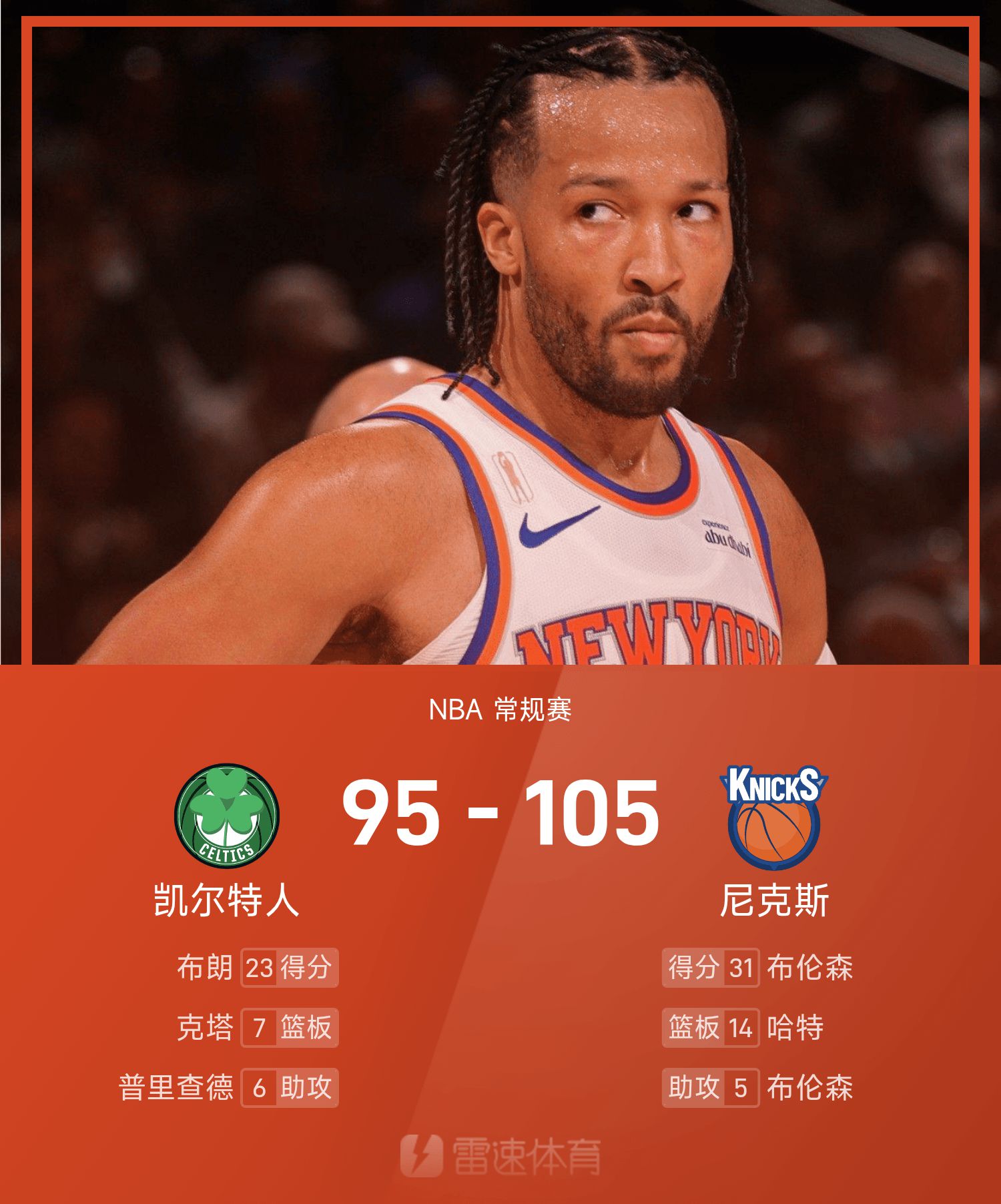 6686体育平台10月25日讯 25/26赛季NBA常规赛,尼克斯对阵凯尔特人。双方全场战罢,尼克斯105-95战胜凯尔特人。布伦森砍下全场最高的31分3板5助,率领尼克斯胜利取胜。