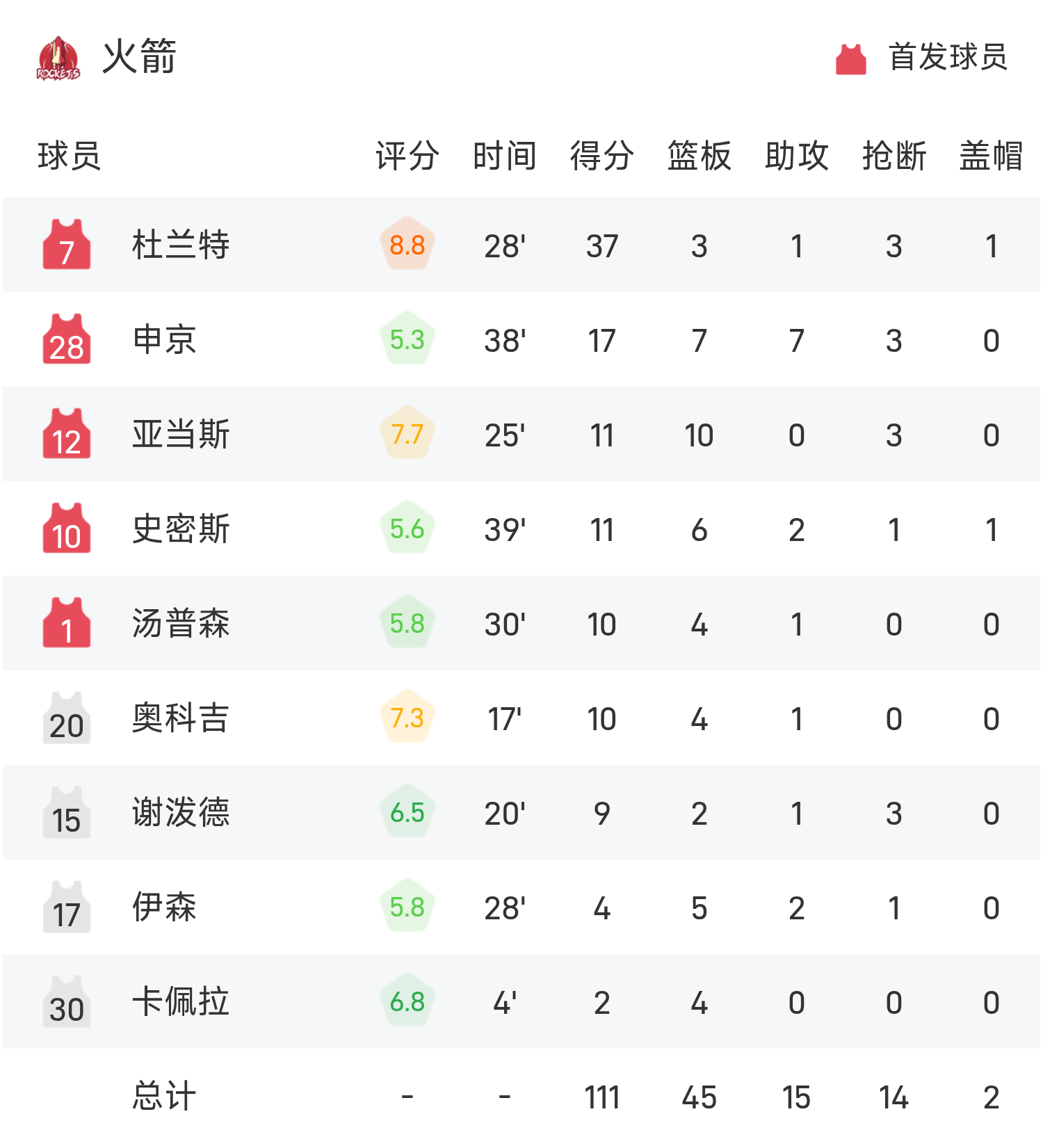 6686体育平台10月25日讯 25/26赛季NBA 常规赛,火箭对阵活塞。双方全场战罢,火箭111-115不敌活塞。康宁汉姆得到21分7板9助率队取胜,杜兰特空砍全场最高的37分3板1助。