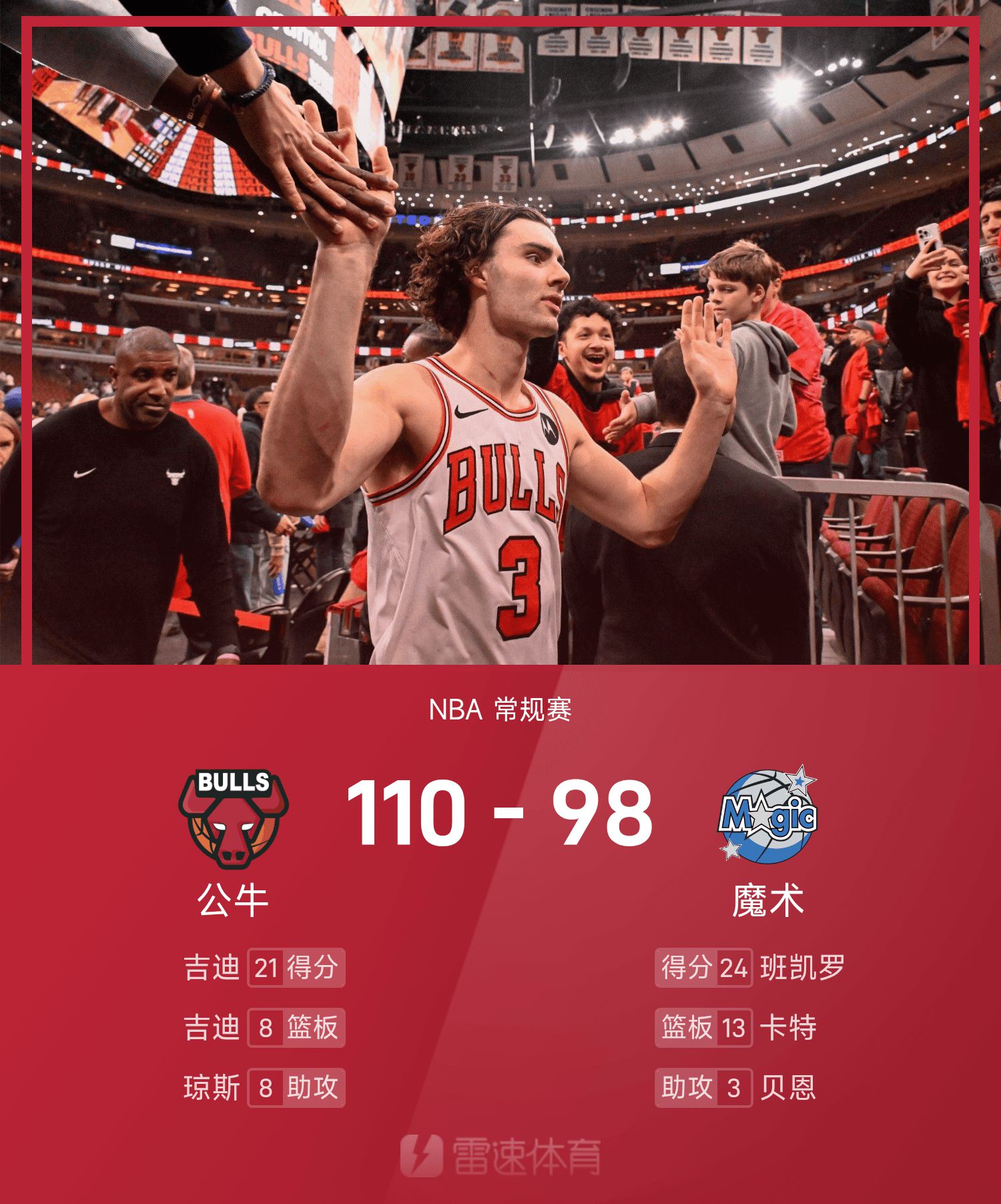 公牛后卫吉迪得到21分8抢篮板3助攻,助球队客队场战胜魔术,迎来两连胜。