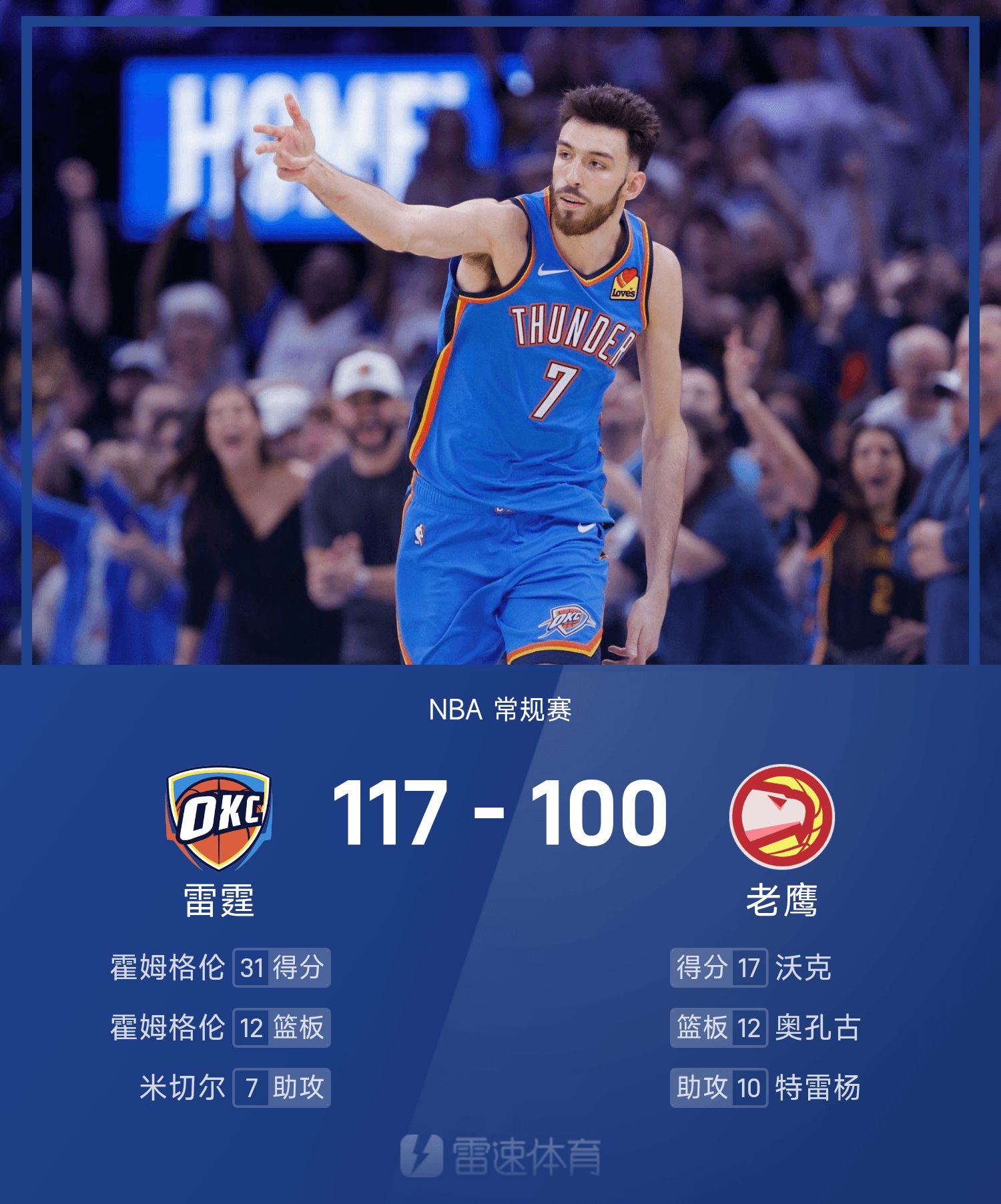 雷霆内线切特·霍姆格伦命中6记三分球球,得到31分12抢篮板3截球;雷霆核心亚历山大仅凭4次罚篮,即得到30分4抢篮板5助攻。雷霆凭借双星闪耀表现,开赛季喜提三连胜。