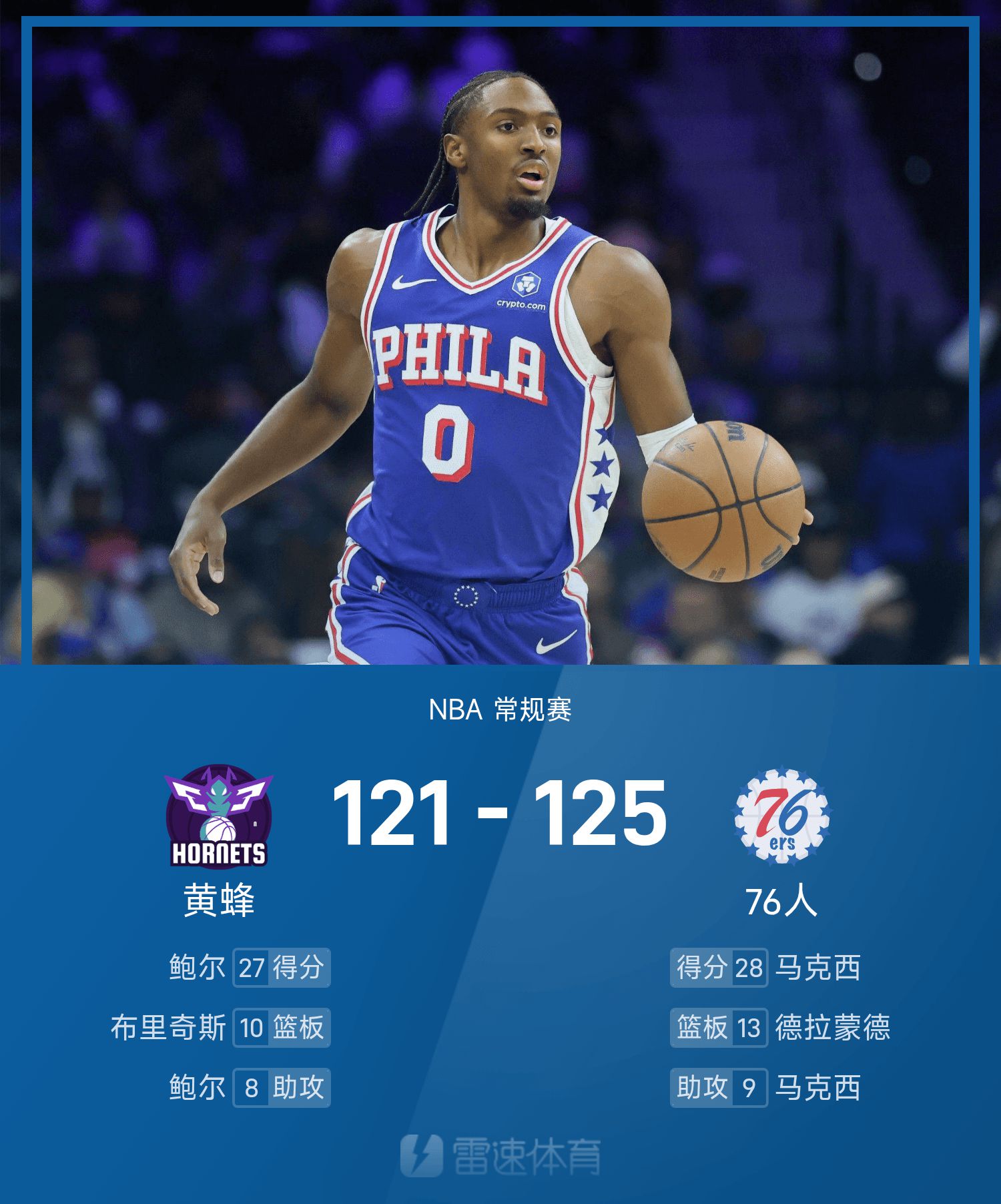 76人后卫马克西得到28分6抢篮板9助攻,得分全场最高;76人后备队员球员格莱姆斯得到24分,最后13秒命中关键三分球助球队逆转局。